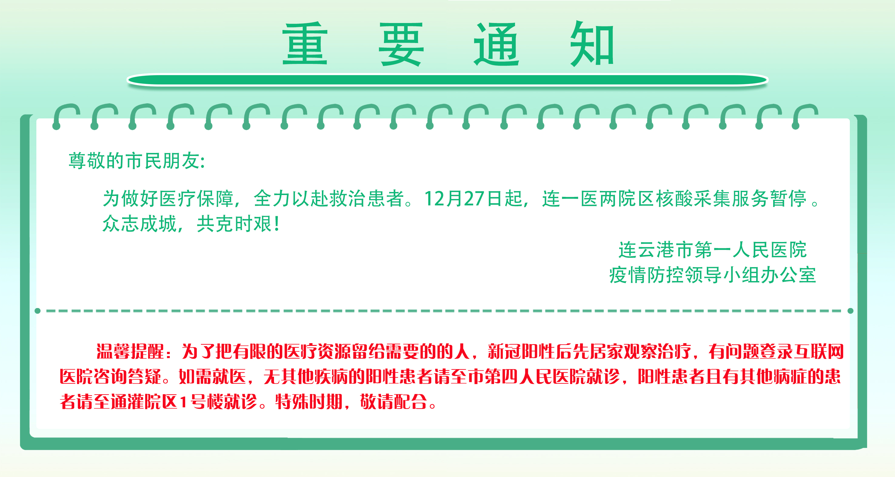 重要通知:12月27日起连一医两院区暂停核酸检测